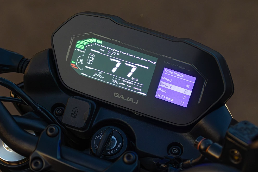 A Dominar NS400Z oferece 4 modos de pilotagem ajustáveis — ROAD, RAIN, SPORT e OFF-ROAD — que otimizam a entrega de potência e o sistema ABS. Essa funcionalidade garante versatilidade e segurança para diferentes estilos de condução e condições de pista.